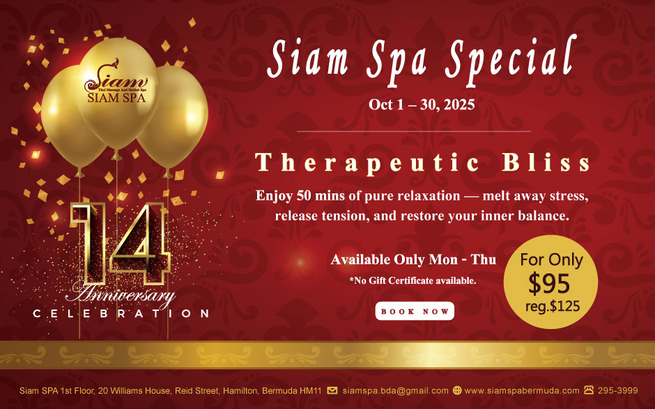 SIAM SPA, Siam Thai Massage And Herbal SPA, is a boutique herbal Every day Spa specializing in Traditional Thai Massage encompassing organic elements to bring Bemuda the very best of Thailand including her exceptional service and hospitality. OPENING TIMES MON-SUN 10am-8pm (last appointment 7pm)