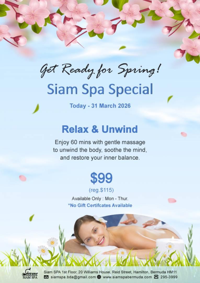 SIAM SPA, Siam Thai Massage And Herbal SPA, is a boutique herbal Every day Spa specializing in Traditional Thai Massage encompassing organic elements to bring Bemuda the very best of Thailand including her exceptional service and hospitality. OPENING TIMES MON-SUN 10am-8pm (last appointment 7pm)