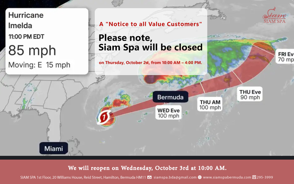 SIAM SPA, Siam Thai Massage And Herbal SPA, is a boutique herbal Every day Spa specializing in Traditional Thai Massage encompassing organic elements to bring Bemuda the very best of Thailand including her exceptional service and hospitality. OPENING TIMES MON-SUN 10am-8pm (last appointment 7pm)