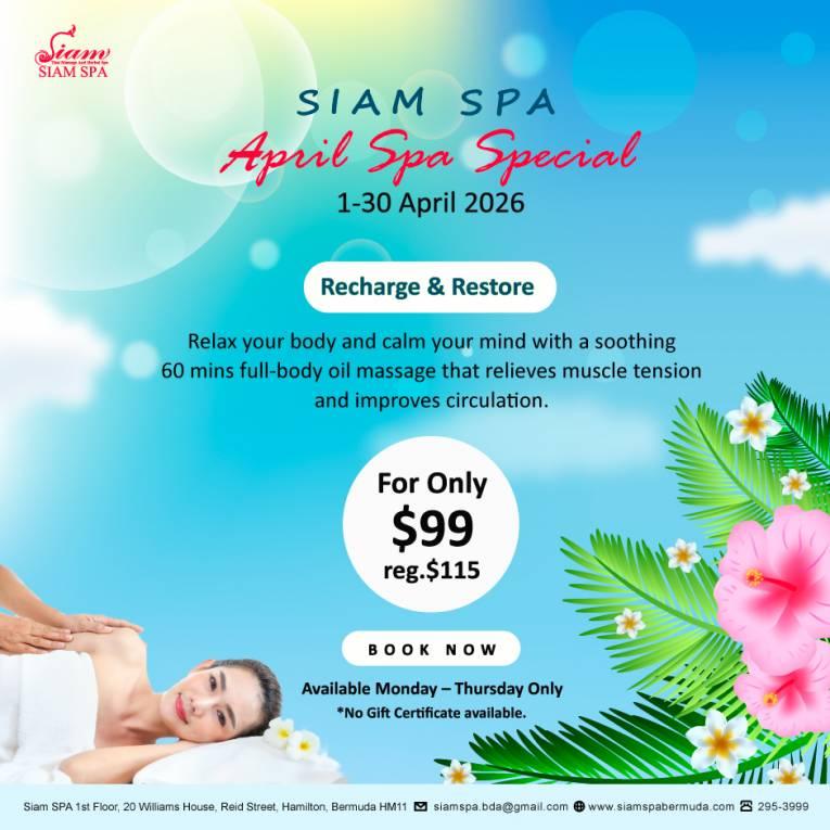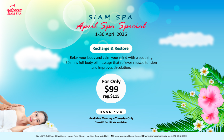 SIAM SPA, Siam Thai Massage And Herbal SPA, is a boutique herbal Every day Spa specializing in Traditional Thai Massage encompassing organic elements to bring Bemuda the very best of Thailand including her exceptional service and hospitality. OPENING TIMES MON-SUN 10am-8pm (last appointment 7pm)