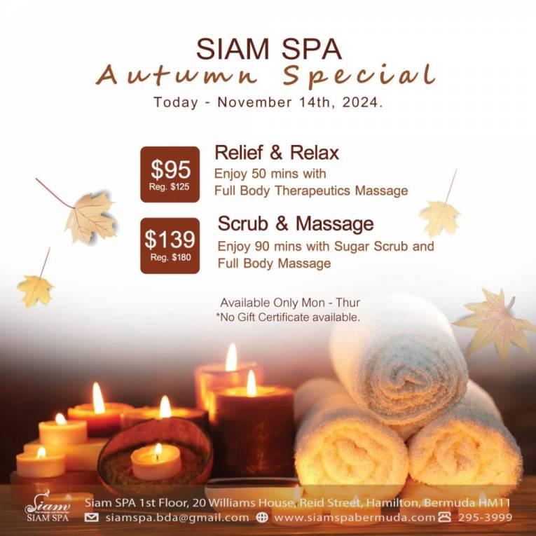 SIAM SPA, Siam Thai Massage And Herbal SPA, is a boutique herbal Every day Spa specializing in Traditional Thai Massage encompassing organic elements to bring Bemuda the very best of Thailand including her exceptional service and hospitality. OPENING TIMES MON-SUN 10am-8pm (last appointment 7pm)