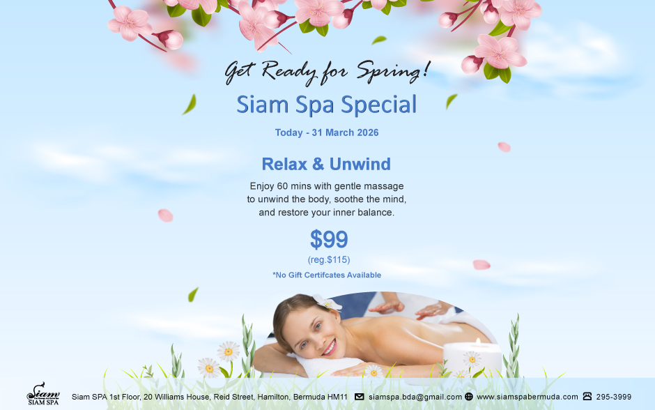 SIAM SPA, Siam Thai Massage And Herbal SPA, is a boutique herbal Every day Spa specializing in Traditional Thai Massage encompassing organic elements to bring Bemuda the very best of Thailand including her exceptional service and hospitality. OPENING TIMES MON-SUN 10am-8pm (last appointment 7pm)