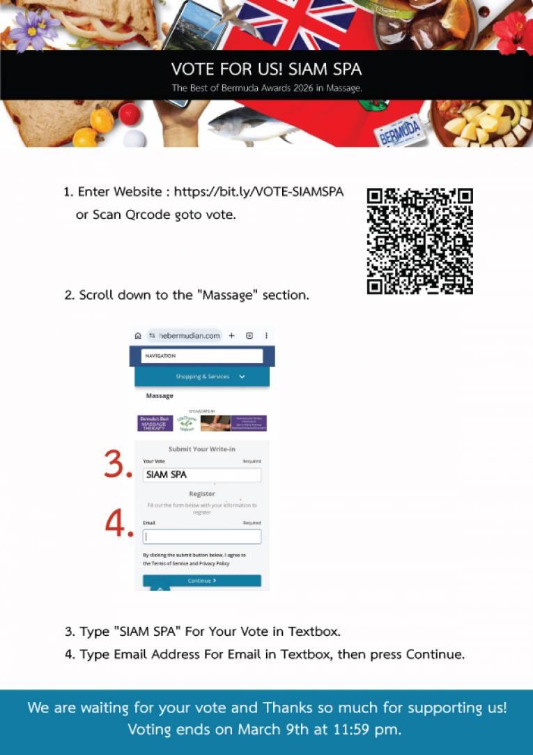 SIAM SPA, Siam Thai Massage And Herbal SPA, is a boutique herbal Every day Spa specializing in Traditional Thai Massage encompassing organic elements to bring Bemuda the very best of Thailand including her exceptional service and hospitality. OPENING TIMES MON-SUN 10am-8pm (last appointment 7pm)